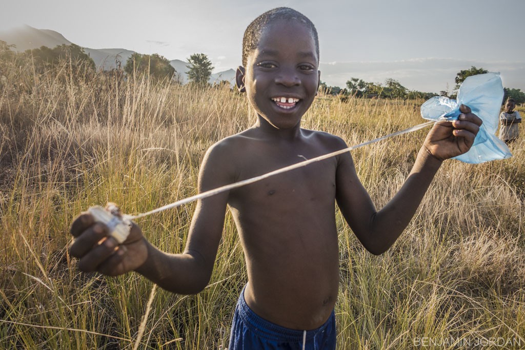 A young by proudly presents me with his home-made parachute toy. Made from a rubbish plastic bag, plastic thread from a torn maize sack and a chunk of maize stalk, the kids here have integrated three items, which previously had no purpose, into a take anywhere toy that can last for weeks and weeks.